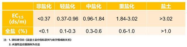 这个标准是对土壤的一个广谱性评价。这里将土壤分为五类,非盐化、轻盐化、中盐化、重盐化和盐土。需要注意的是这里的土壤EC值针对的是土水比为1:5时的测定值,单位是ds/m或者ms/cm。这里的全盐值就是土壤水溶性盐总量,单位是%。