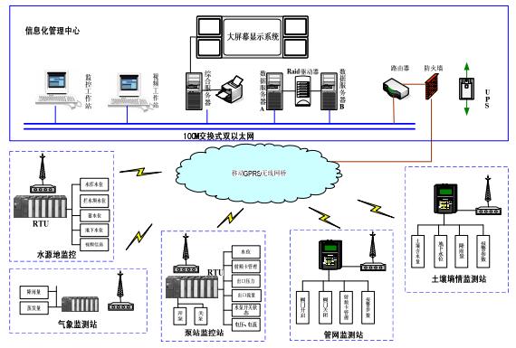 本项目采用先进的计算机技术、网络技术和通信技术,在灌溉示范区内建立起一套高效节水灌溉信息化管理系统,将涉及节水灌溉管理所需的各种关键数据。 如上游水库、拦河坝的水位及蓄水量、扬水泵站出水压力及水量、塘坝水位、二级水泵出水量、水泵运行参数、管网节点阀门状态、射频卡用户数据、地下水位、降雨量、蒸发量、土壤温湿度以及关键节点的视频等实时传输至信息管理中心平台。同时可以远程控制和调节水泵的运行参数、阀门的开启等执行设备,以实现自动化数据上传、控制指令下发和信息的共享和融合,为项目示范区内的高效节水灌溉管理、安全监控、水资源优化调度提供决策依据。