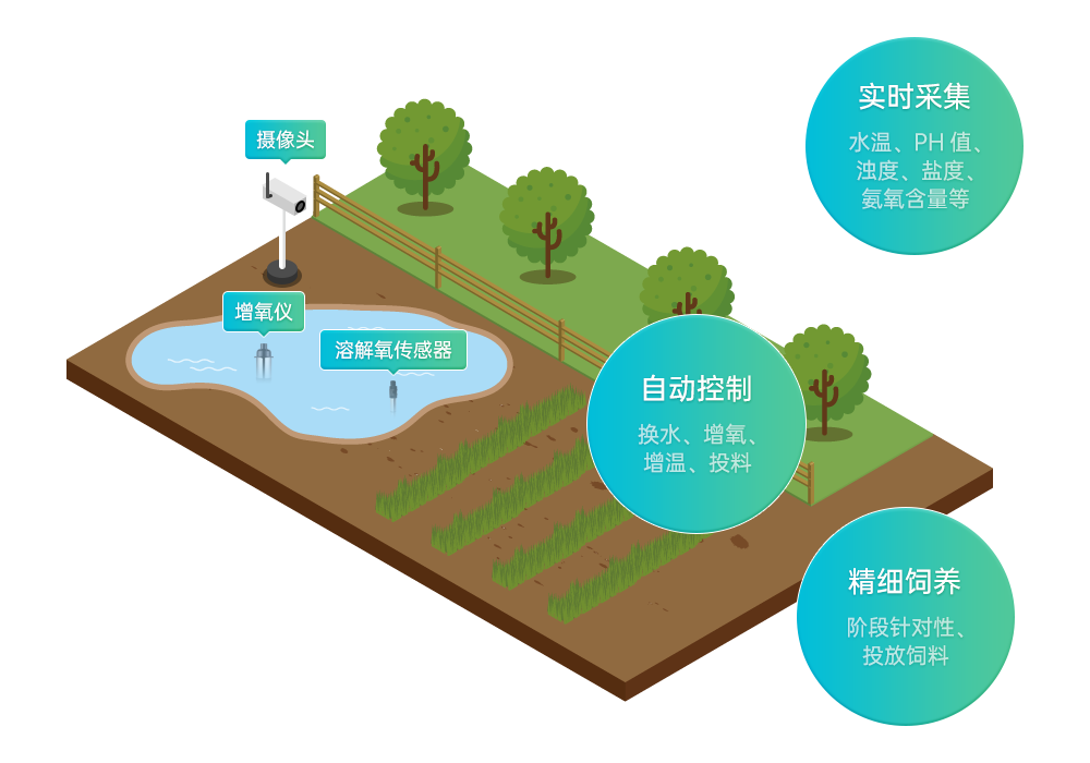 2.联动管理:实现远程增氧、投料、循环泵、摄像头等设备联动控制,节省时间人力成本。
