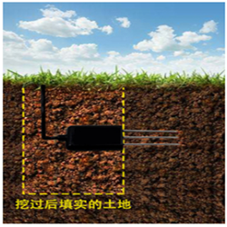 垂直挖直径>20cm的坑,在既定的深度将传感器钢针水平插入坑壁,将坑填埋严实,稳定一段时间后,即可进行连续数天,数月乃至更长时间的测量和记录。