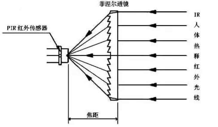 为了提高探测器的探测灵敏度以增大探测距离,一般在探测器的前方装设一个菲涅尔透镜,利用菲涅尔透镜的特殊光学原理,在探测器前方产生一个交替变化的“盲区”和“高灵敏区”,以提高它的探测接收灵敏度。