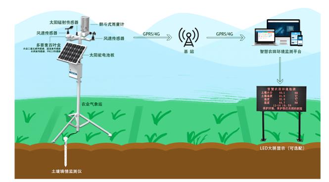 农业大田智能监测系统主要由农业气象站、农田环境监测平台及LED显示大屏组成,农业气象站包含土壤墒情监测仪、多要素百叶盒、太阳辐射传感器、翻斗式雨量计、风速风向传感器组成,可