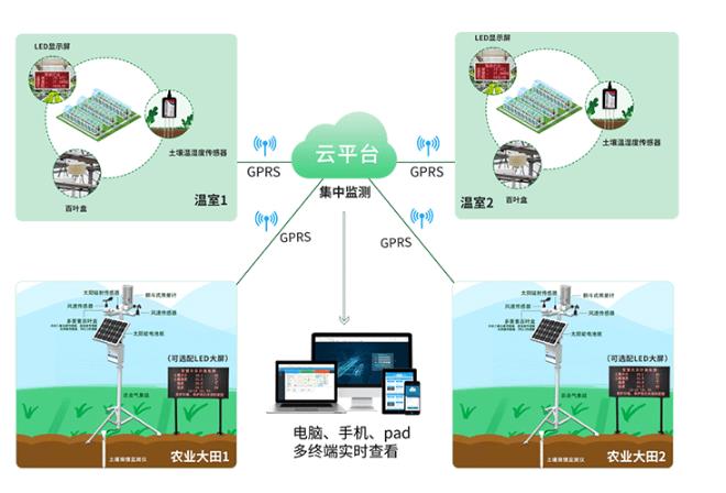 以实时监测农田内的的空气温湿度、土壤温湿度、土壤电导率、二氧化碳浓度、大气压力强度、光照强度、风速风向等参数,并通过GPRS实时上传至农业环境监测平台,然后通过通信服务器传到LED显示大屏,实时查看数据。