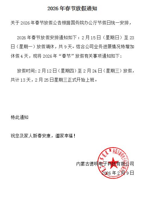 2026年新春佳节即将来临,内蒙古德明电子科技有限公司在此向您致以最真挚的祝福和问候,提前祝您新春愉快!根据国家法定节假日规定,并结合我司实际情况,现将2026年春节放假通知如下